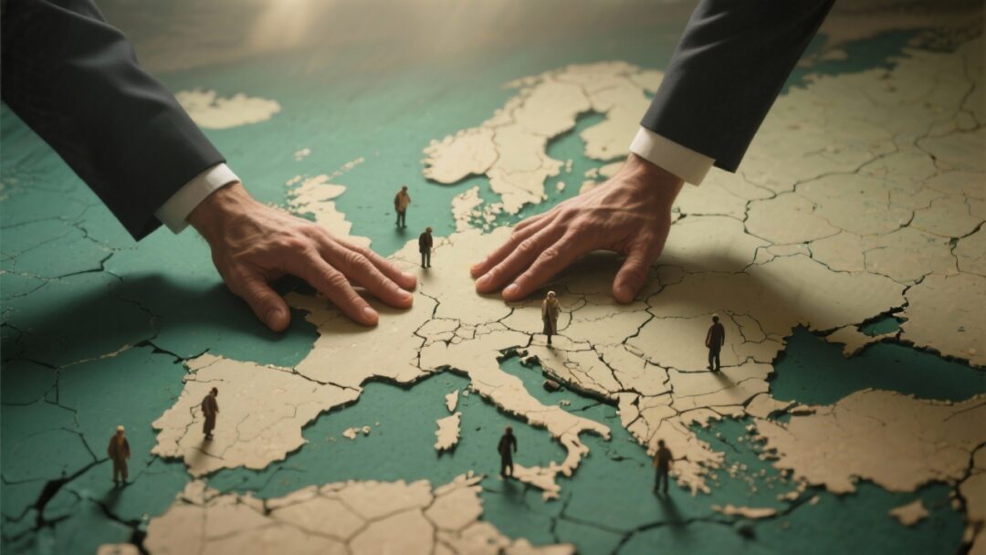 Create a powerful and symbolic photorealistic image depicting the hands of two diplomats in sharp, dark suits, forcefully pressing down on a fragmented map of Europe made of cracked earth, with tiny, faint figures of refugees caught in the fissures. The lighting should be dramatic and high-contrast, casting long shadows, symbolizing the heavy-handed policy and its human cost.